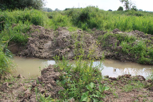 Mitte Juli wurden die Vorbereitungen abgeschlossen aber noch immer rollen keine Bagger durch das Gebiet. Wie kann das sein? Der Tag für den Baubeginn zum 1.August kam und verstrich da die Flächen noch nicht durch das Ordnungsamt beziehungsweise die Bezirksregierung Düsseldorf freigegeben wurden. Wir stehen in den Startlöchern um sofort mit den Arbeiten zu beginnen denn das Zeitfenster, das uns bis Oktober zur Verfügung steht, ist sehr kurz. Momentan schlagen zwei Herzen in unserer Brust: der Biologe wünscht sich beim Anblick der vertrockneten Wiesen während dieser Dürre unbedingt Regen, der Bauherr weiß aber auch, dass Regen die Bauarbeiten weiter erschweren würde. Es heißt also in jedem Falle: Keep calm and keep on smiling.