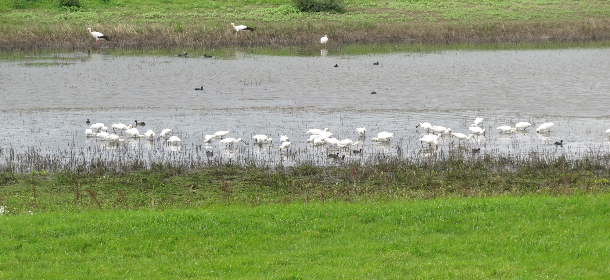 Die neu entstandenen Flachwasserbereiche in der Emmericher Ward entwickeln sich zu wertvollen Nahrungsräumen für die Löfflerkolonie auf der anderen Rheinseite. Während der Brutzeit lassen sich regelmäßig Altvögel an den Flutmulden und Altwassern der Ward beobachten, die hier Nahrung für ihre Jungen suchen.