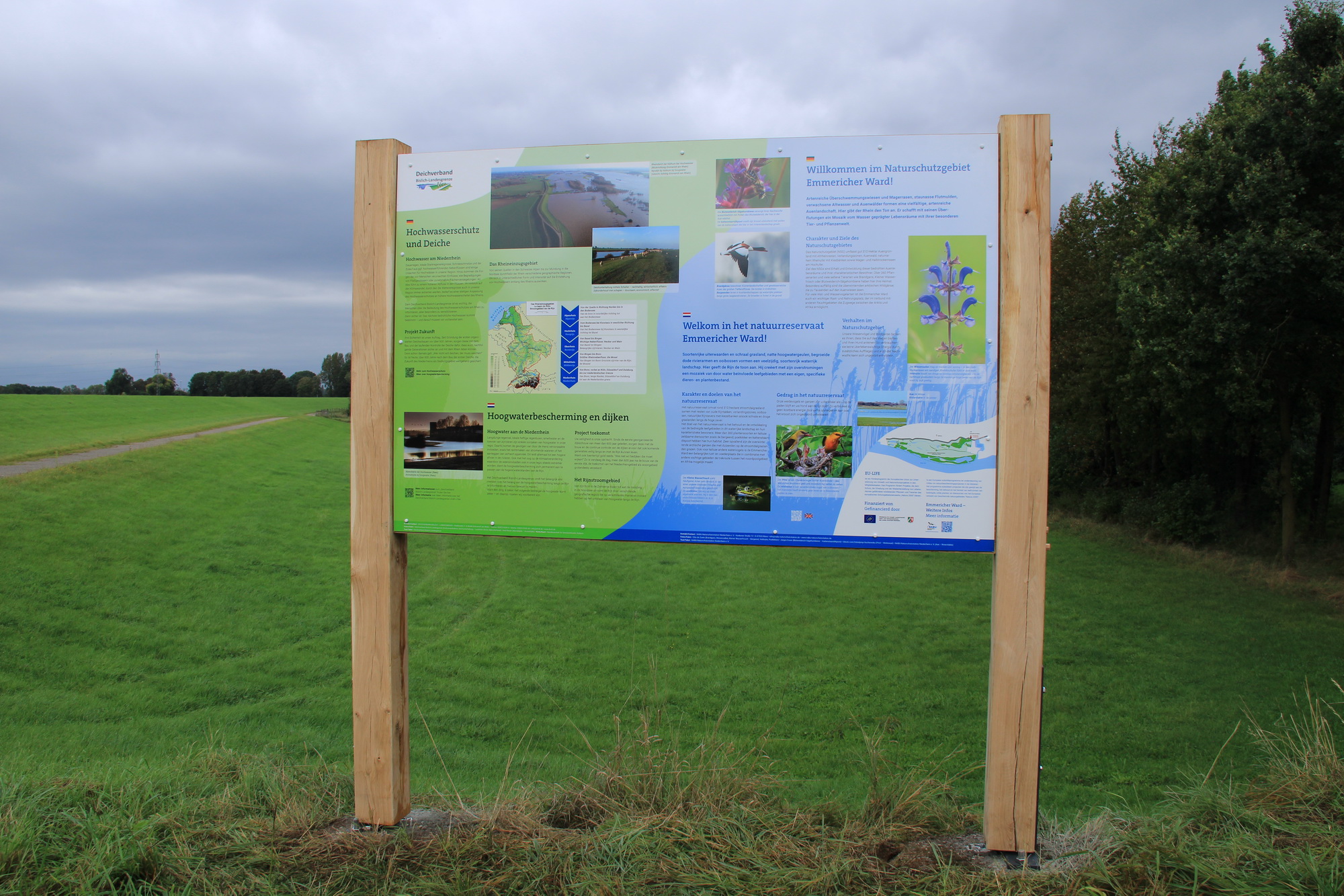 Two signs with identical content are located at the entrances of the area – on Rundestraße near the Dutch border and on Fackeldeystraße near the marina. The third sign can be found near the hikers' hut, approximately in the middle of the Banndeich.